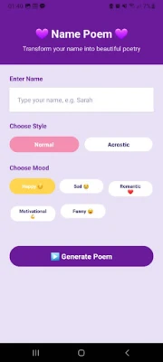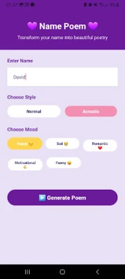 Name Poem transforms any name into stunning, personalised poetry using advanced AI technology, whether you want an acrostic poem or a traditional verse. Our app crafts meaningful verses that celebrate the uniqueness of every name.
