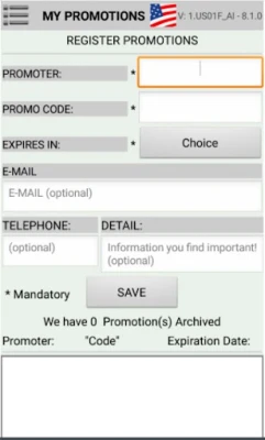 In the 'menu', under "REGISTER", as soon as you receive your coupon or promotion, you enter them in "My Promotions"; inserting the "PROMOTER", the "PROMOTIONAL CODE" (this 'case sensitive') and the "EXPIRATION DATE OF THE CODE" of this coupon! These three are mandatory! And, if you want to save the means of receipt of the promotion / coupon, (optional for the completion) will have the "E-MAIL", the number of the "PHONE" and a field to write some relevant and important "NOTE".