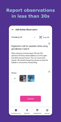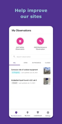 As part of your visit or daily work on one of our sites, MySite enables you to easily report safety and maintenance observations. You can submit any hazardous condition, non-compliance, required action or idea for improvement with photos in a few seconds, all on your smartphone. The responsible zone owner is notified and you can track the progress made.